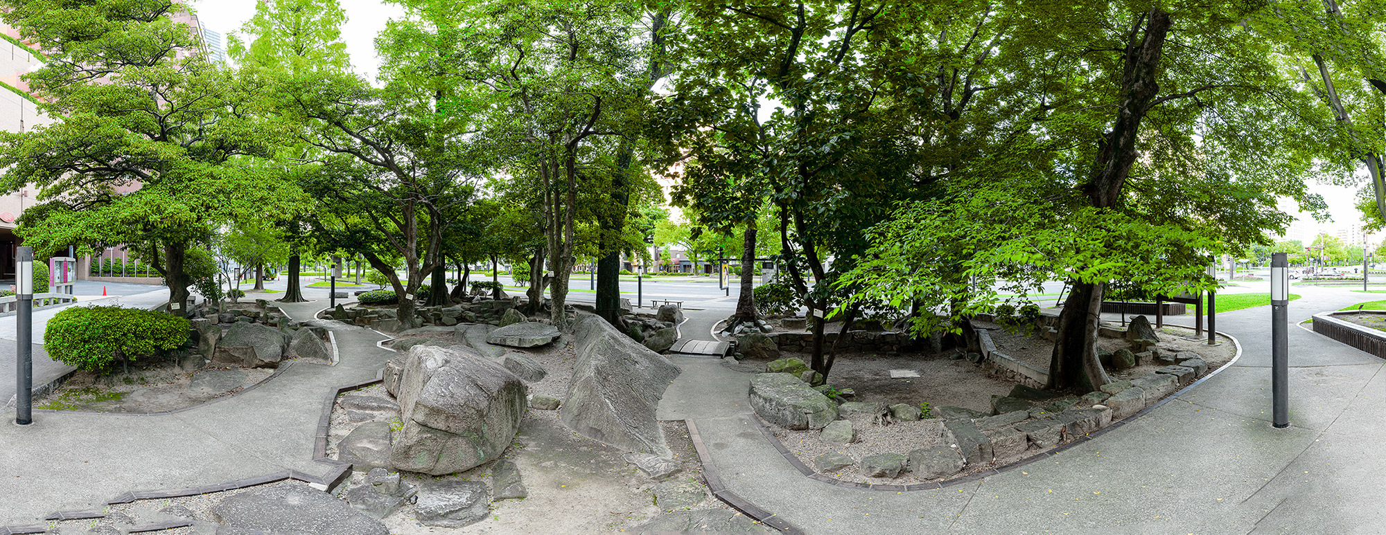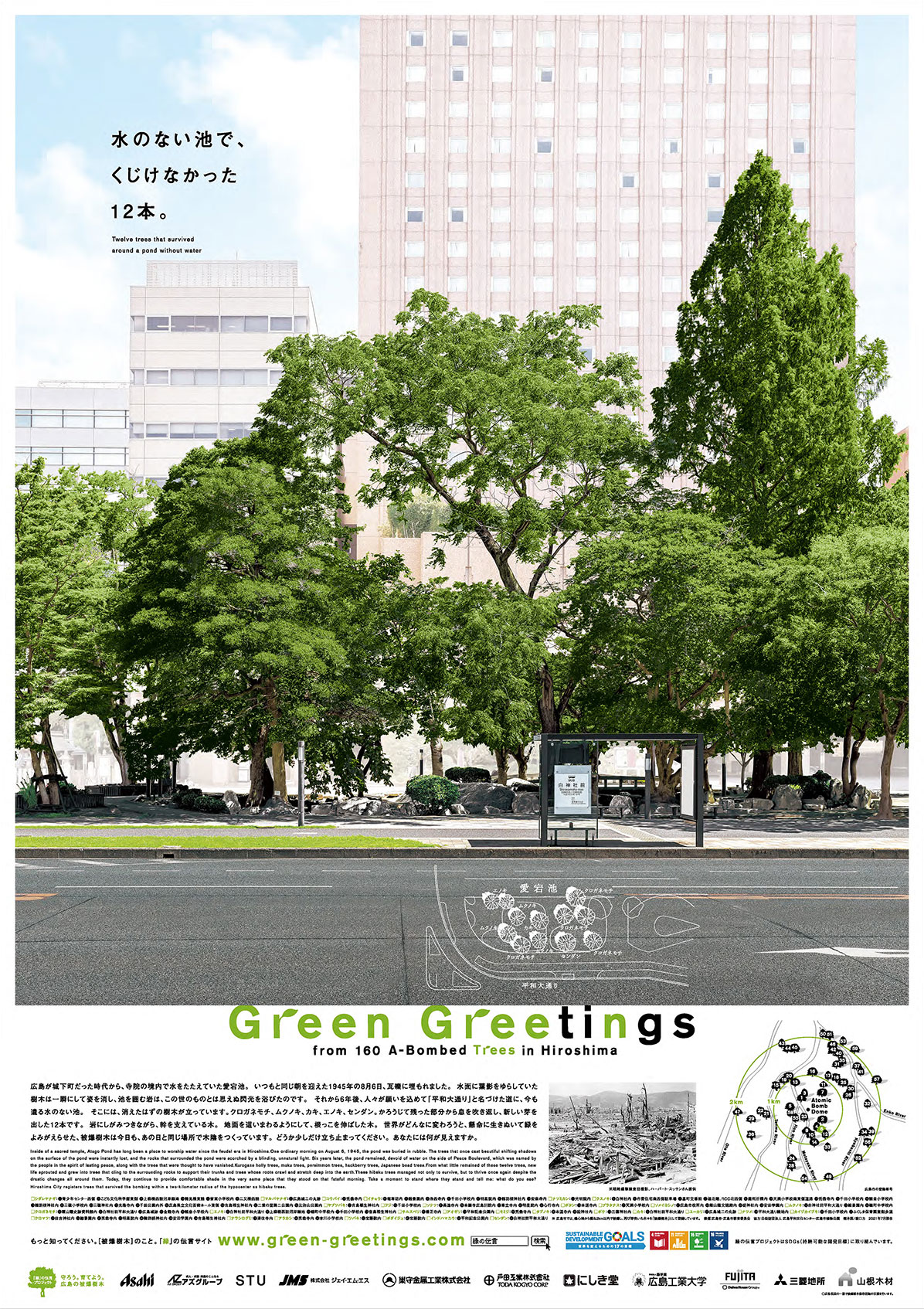 広島が城下町だった時代から、寺院の境内で水をたたえていた愛宕池。 いつもと同じ朝を迎えた1945年の8月6日、瓦礫に埋もれました。 水面に葉影をゆらしていた樹木は一瞬にして姿を消し、池を囲む岩は、この世のものとは思えぬ閃光を浴びたのです。 それから6年後、人々が願いを込めて「平和大通り」と名づけた道に、今も遺る水のない池。 そこには、消えたはずの樹木が立っています。クロガネモチ、ムクノキ、カキ、エノキ、センダン。かろうじて残った部分から息を吹き返し、新しい芽を出した12本です。 岩にしがみつきながら、幹を支えている木。 地面を這いまわるようにして、根っこを伸ばした木。 世界がどんなに変わろうと、懸命に生きぬいて緑をよみがえらせた、被爆樹木は今日も、あの日と同じ場所で木陰をつくっています。 どうか少しだけ立ち止まってください。 あなたには何が見えますか。